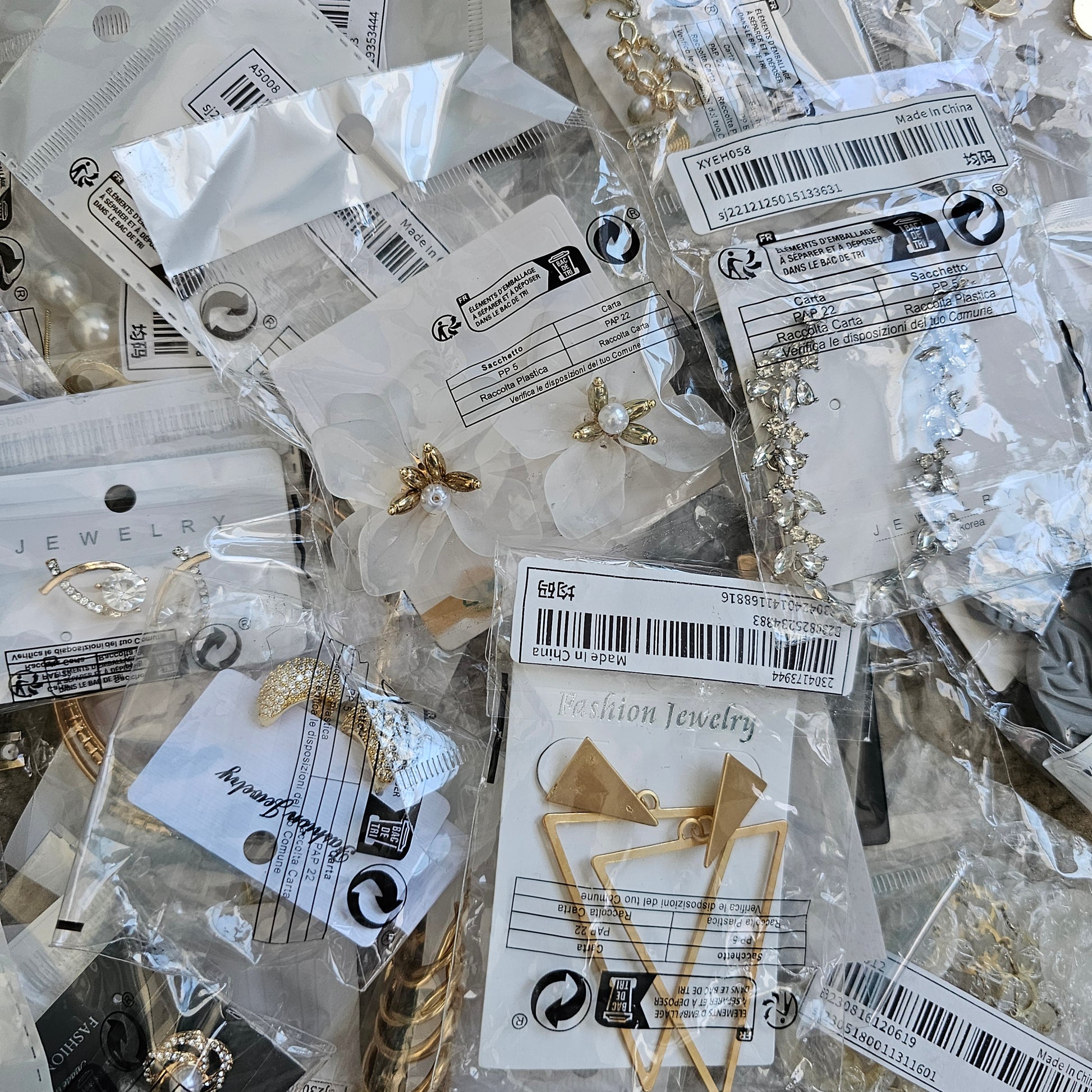 This lot includes 50 pieces of brand new jewelry. Each piece comes individually wrapped. Some of the earrings are "sets" and include more than one pair per package; this still counts as one piece.